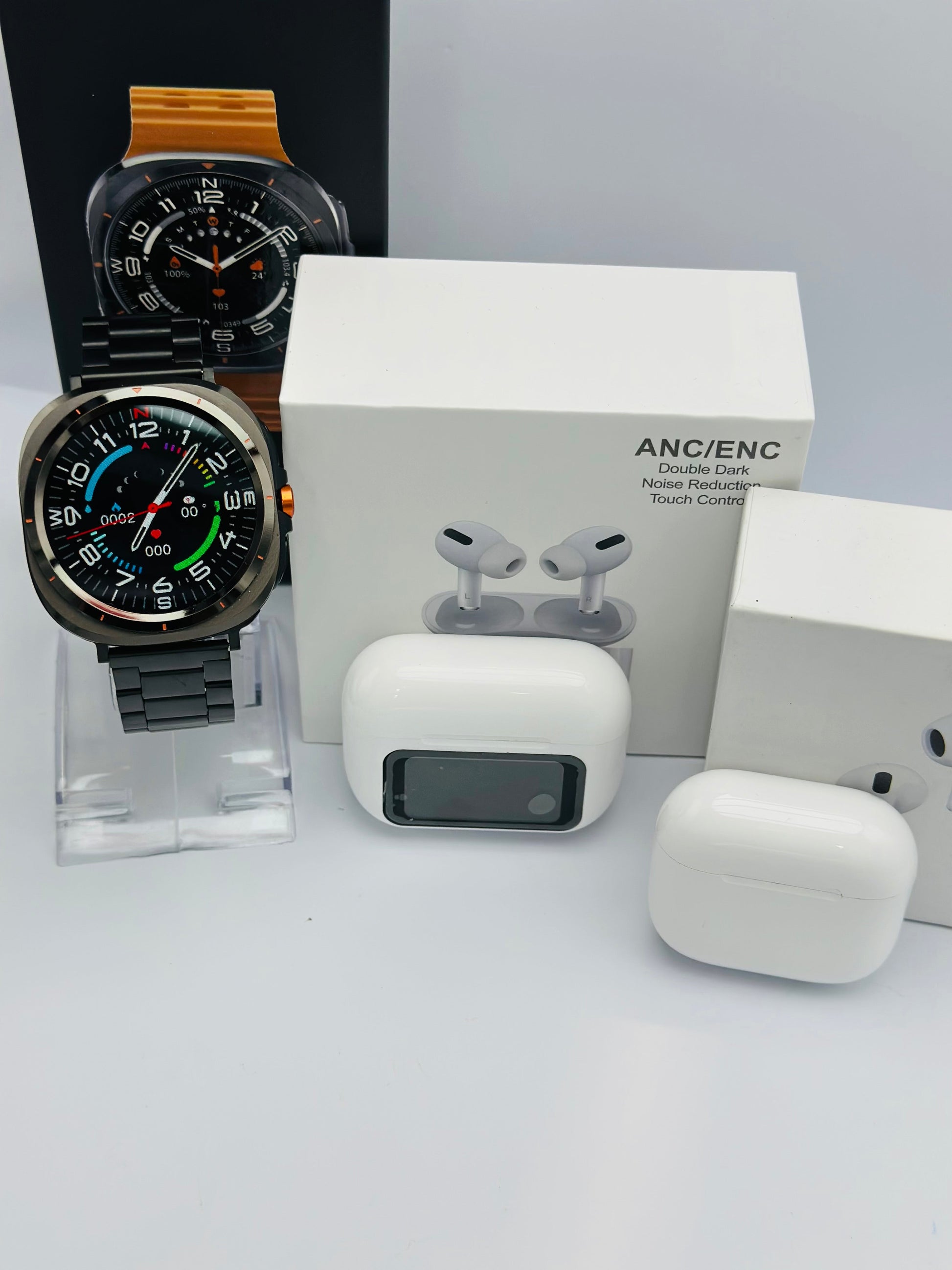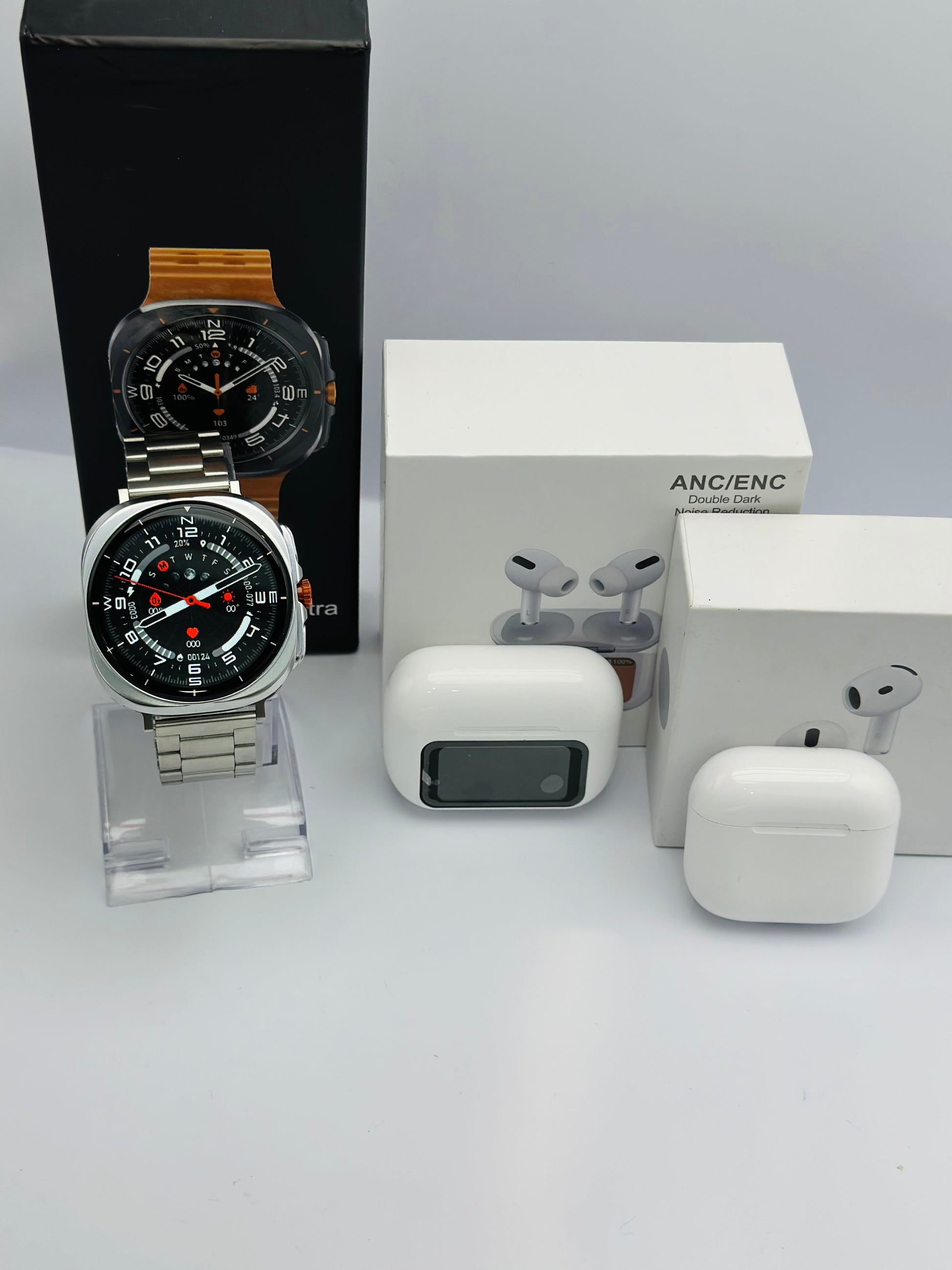 Family bundle 1: This bundle includes 1 - 7 Ultra Smart Watch RLX (Two color option available: Black/Silver), 1 - Touch Screen Air-Pods , and 1 - Air-pods 4