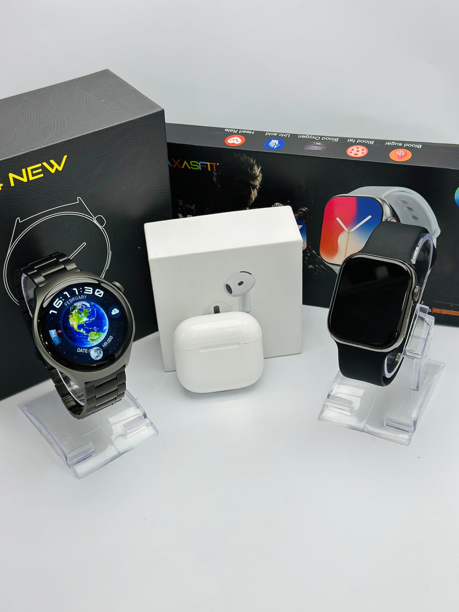 Family bundle 3: This bundle includes 1 - JS Watch 4 (Two color options available: Black/Silver), 1 - Watch X (Two color options available: Black/Silver), and 1 - AirPods 4