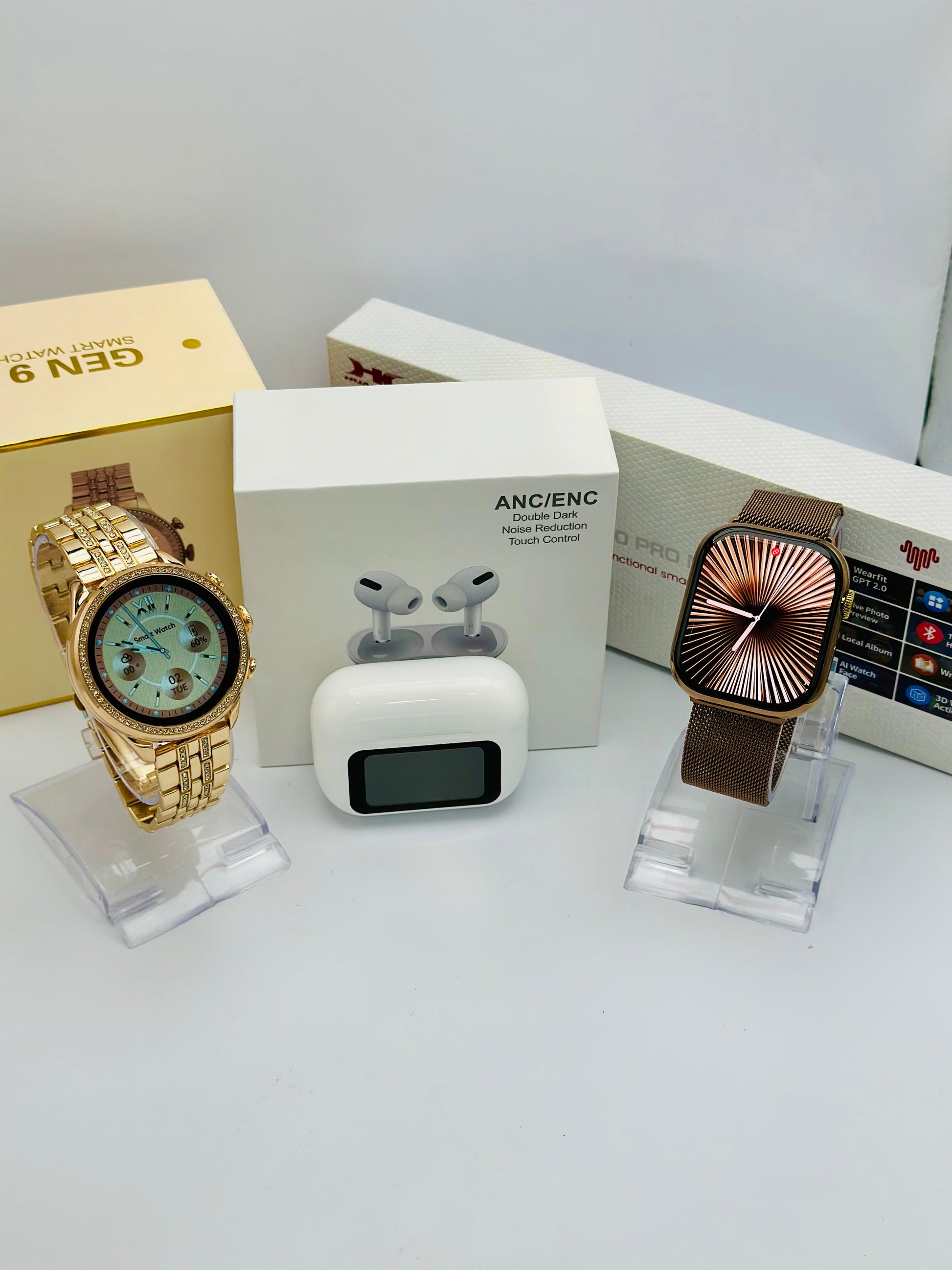 Family Bundle 7: This bundle includes 1 - Gen 9 (Color Only Rose Gold Available), 1 - HK10 Pro Max (Three color option available: Black/Silver/ Dessert Titanium), and 1 - Touch Screen AirPods